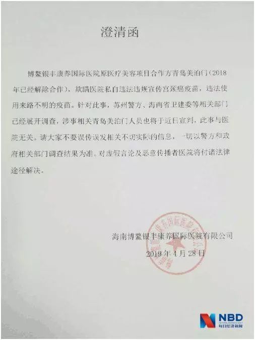 此外,记者从一名受害人处获悉,博鳌银丰康养国际医院给他们发来一份澄清函,称原医疗美容项目合作方青岛美泊门,欺瞒医院私自违法违规宣传宫颈癌疫苗,违法使用来路不明的疫苗。此事与医院无关。