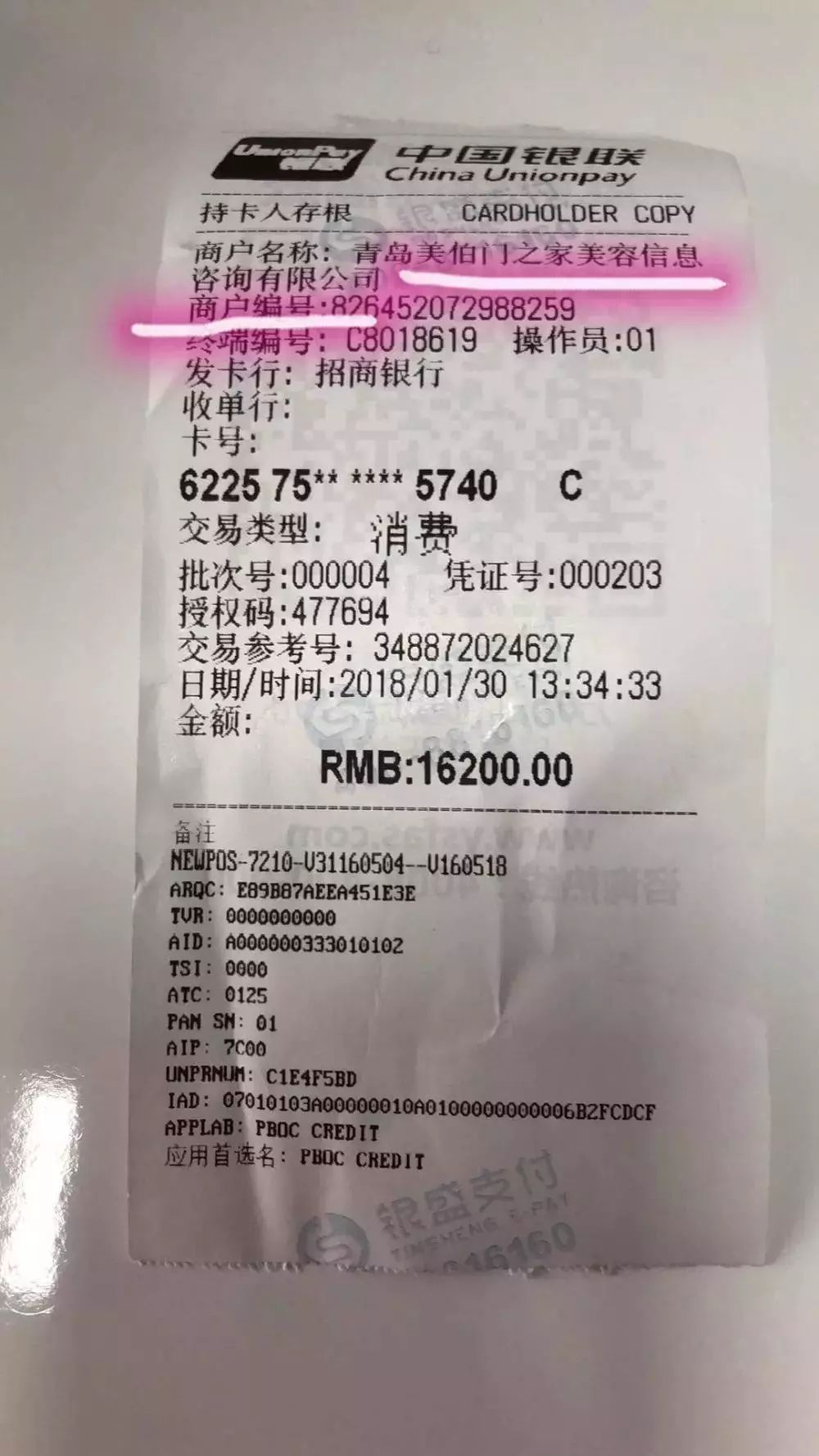 记者发现,该举报人上传的图片中,一张银联支付单上的商户名称为:青岛美伯门之家美容信息咨询有限公司。另一张电子付款信息显示,收款人为:青岛即墨市承达加油站。