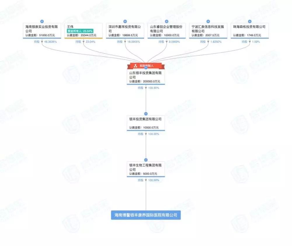 记者在查询启信宝发现,多家公司通过多层结构持有博鳌银丰康养国际医院股权,直接股东是银丰生物工程集团。除了这家医院,该集团还在全国多地开设了干细胞工程、生物工程、医疗科技相关公司。