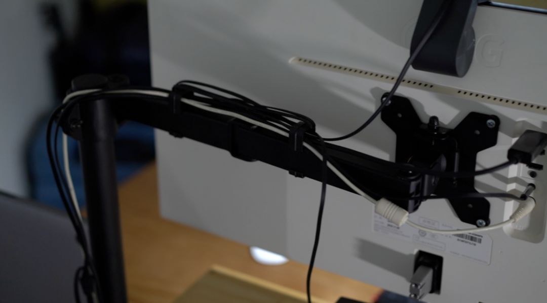 比如显示器支架,我把之前使用的乐歌的支架换成了现在这个淘宝杂牌。说心里话,比乐歌的好用太多了,而且才100块。这个支架有很多走线的卡槽,电源线、HDMI线、还有音频线、灯的电源线都可以通过这些卡槽一步一步走到桌面以下,同时在桌面的正面也看不出来。