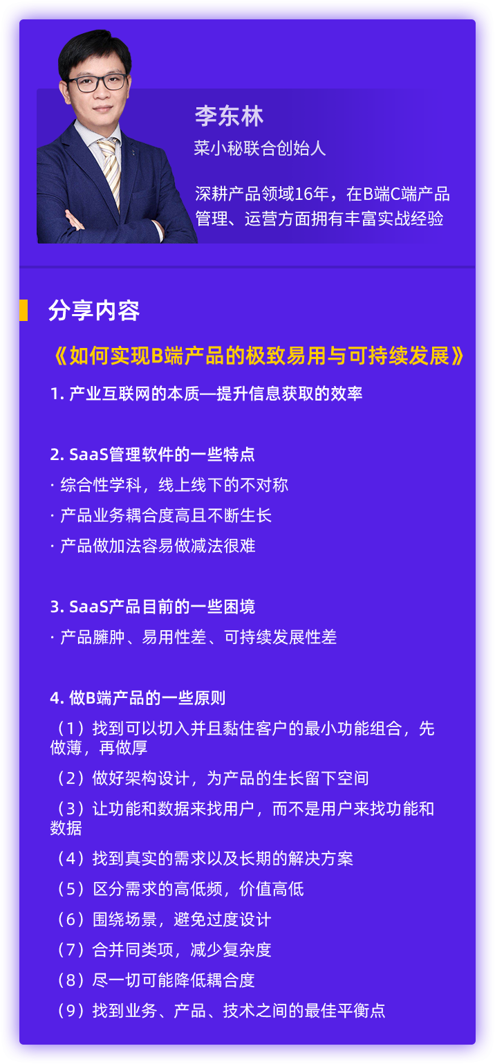 To B SaaS、To C移动互联网领域的连续创业者,拥有16年B端&C端产品管理、运营经验的菜小秘联合创始人@李东林,将和你聊聊如何实现B端产品的极致易用和可持续发展。