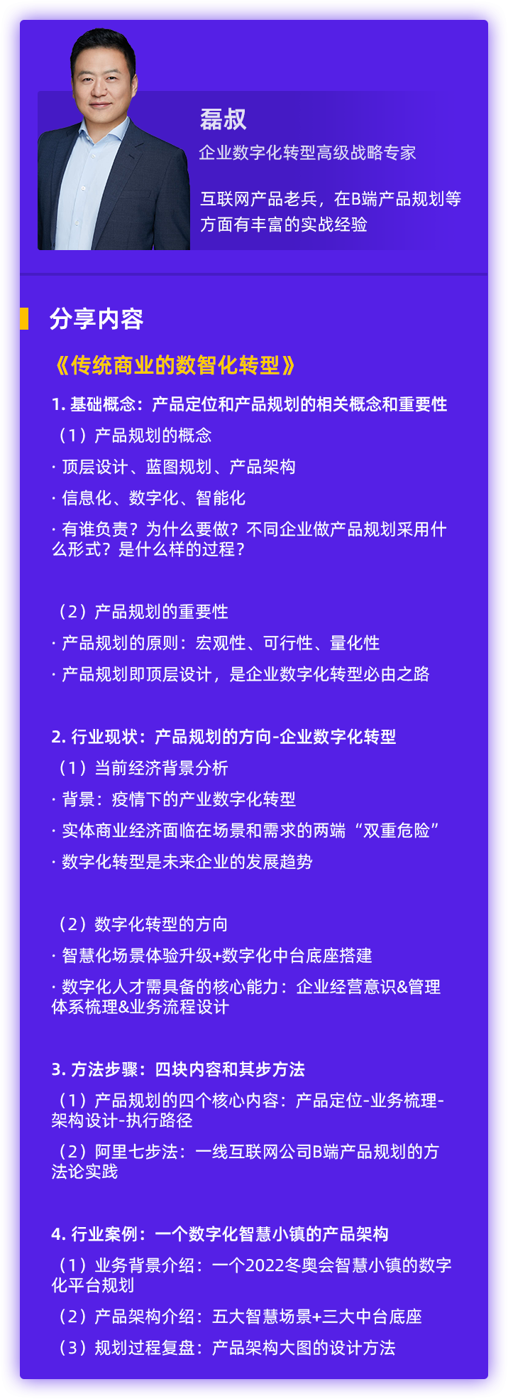 擅长“智慧+”电影、文旅、产业园、场馆、商业等SaaS产品的数字化转型,在B端产品规划、数字化战略顶层设计等领域拥有丰富经验的企业数字化转型高级战略专家@磊叔,将谈谈传统商业的数智化转型。