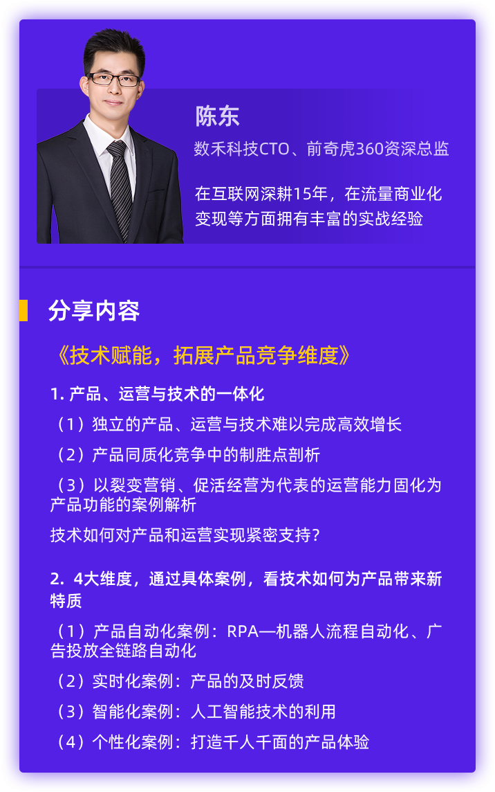 深耕互联网行业10多年,在流量商业化变现、营销与增长、技术赋能业务方面拥有丰富实战经验的数禾科技CTO@陈东,将从技术的视角,聊聊商业增长的一些思考。