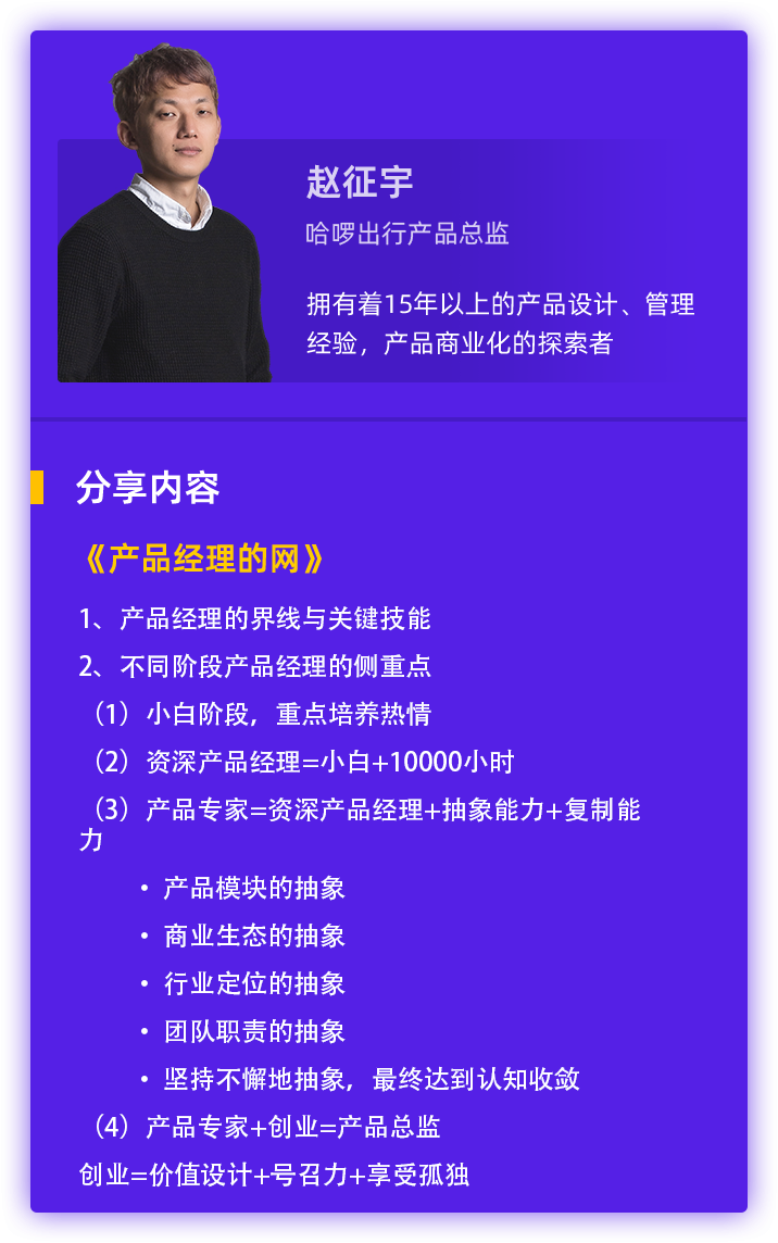 既是连续创业者,也是增长体系搭建者、产品商业化探索者,拥有15+年产品管理经验的哈啰出行产品总监@赵征宇,将结合自身经验聊聊他对于产品经理新可能的思考。