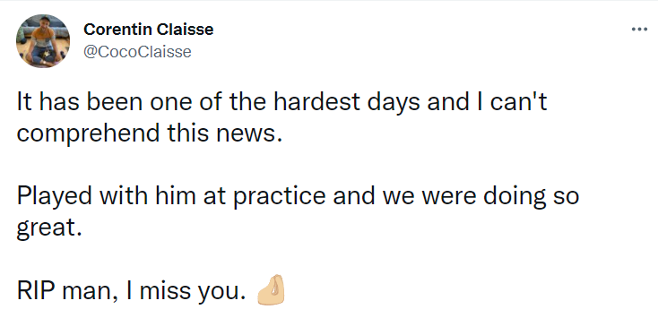 「这是我最难受的日子之一,我到现在还无法接受这个消息。在训练中和他一起踢过球,我们做得很好。安息吧,伙计,我想你。」