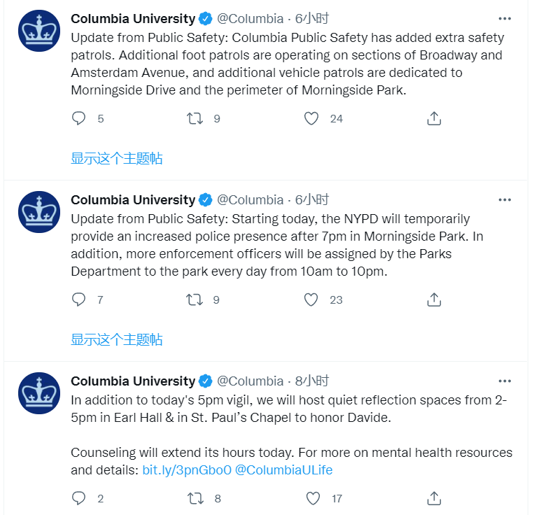 此外,哥伦比亚大学官方连续发布数条推文,宣布为Giri举办烛光守夜活动,并承诺加强校园周边的安全措施,进一步增加对案发地Amsterdam Avenue、Morningside Park附近周边地区的巡逻密度。