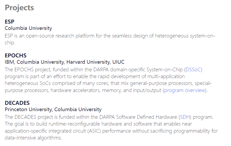 其中包括无缝设计异构片上系统的开源研究平台的开发和设计,以及由DARPA资助的DACADE项目,构建运行时可重新配置的硬件和软件,在不牺牲数据密集型算法的可编程性的情况下,实现接近专用集成电路 (ASIC) 的性能。