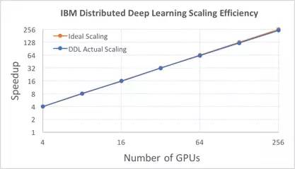 IBM 通过 DDL 软件近乎完美地解决了这种拓展带来的性能损失问题,最显著的体现指标就是拓展效率,换句话说就是随着GPU数目的增加,实际系统和理想系统之间的差距有多大。这个指标也从侧面反映了学习过程中这256个GPU之间互相沟通得到底好不好。