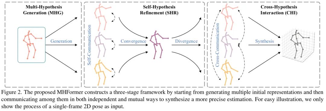 这篇文章的核心思想是通过学习多重姿态假设的时空表示来合成更准确的三维姿态。为了实现这一点,作者提出了一个三阶段框架,叫多假设Transformer(Multi-Hypothesis Transformer,MHFormer)。如图2所示,该框架从生成多个初始表示开始,逐渐在它们之间进行通信以合成更准确的估计。该框架可以有效地建模多假设的依赖,并在假设特征之间建立牢固的联系。
