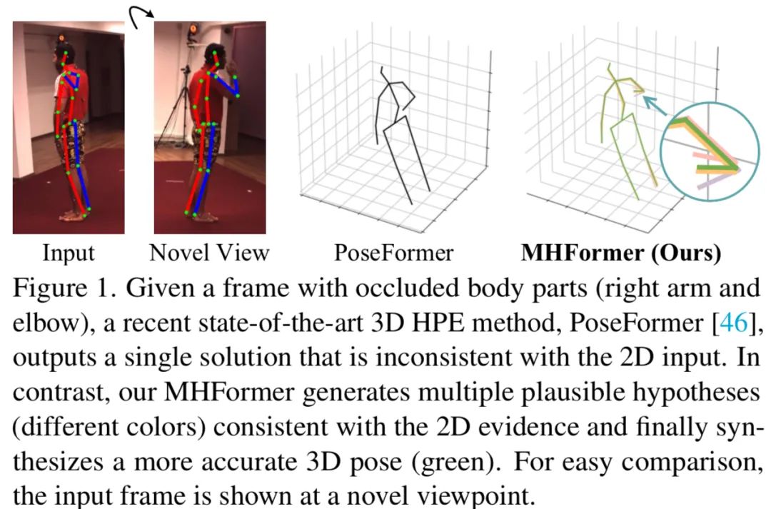 先前的工作尝试使用时空图卷积或时空Transformer来利用时空约束来解决该问题。然而,该任务也是一个存在多个可行解(假设)的逆问题(inverse problem),具有巨大的歧义性。该问题的产生主要是由于相机成像过程中深度信息的丢失,造成多个三维姿态投影到二维空间可能存在相同的二维姿态。从而形成一对多的病态问题,并且在遮挡的情况下该问题会被进一步放大。这些工作大多忽略了该问题本质上是个逆问题,并且只假设存在一个解,这通常会导致估计出不满意的结果(见图1)。
