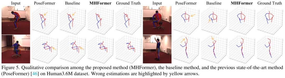 作者给出了跟之前的SOTA和Baselie的可视化结果对比,可见提出的MHFormer取得了更好的结果。
