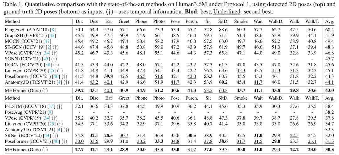 从表中可见,提出的MHFormer在三维人体姿态估计最具有代表性的数据集Human3.6M上实现了SOTA的性能。作者跟大量的21年最新方法进行了对比,并在平均关键点误差(MPJPE)上超越PoseFormer(ICCV 2021) 1.3mm,3%的提升。