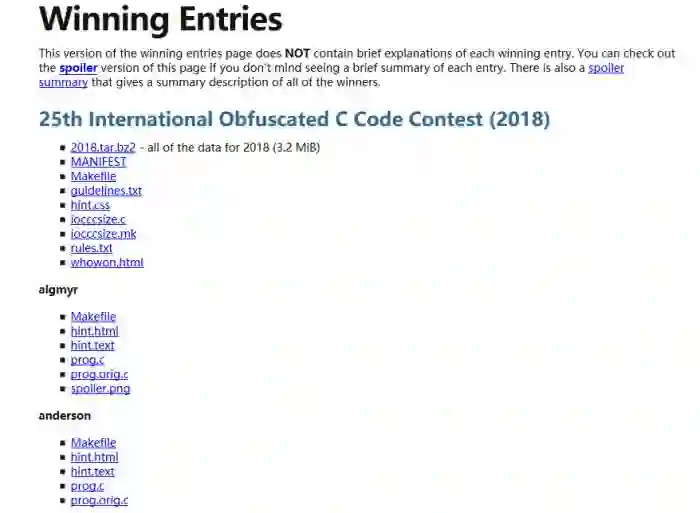 第 25 届国际 C 语言混乱代码大赛(IOCCC)公布了获奖作品的源代码。IOCCC 要求参赛者写出最有创意的最让人难以理解的 C 语言代码,并限制在 4 kilobytes 以内,因此每位参赛者的作品都令人印象深刻。