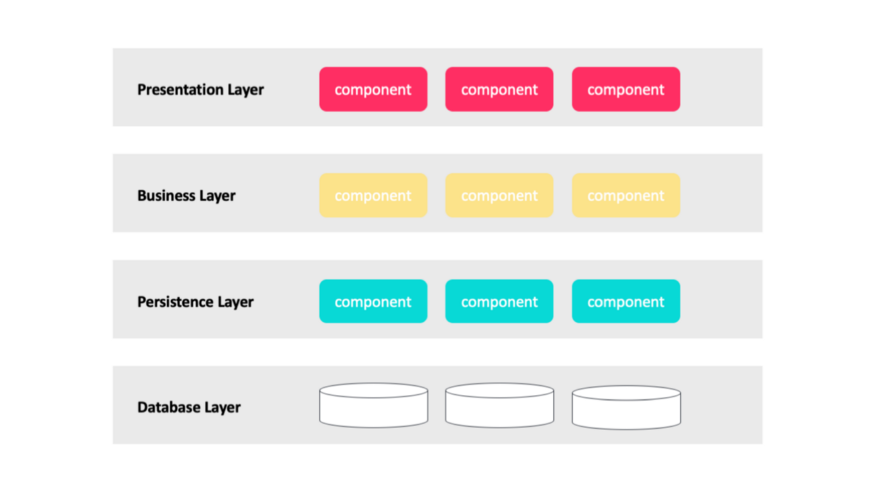 大部分软件架构师、设计师和开发者都对这个架构模式非常熟悉。尽管对于层的数量和类型没有具体限制,但大部分分层架构主要由四层组成:展现层、业务层、持久层和数据库层,如下图所示。