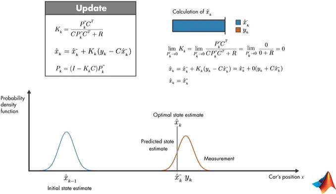 在图7中,我们用了概率密度函数去描述KF的中心思想,假设我们用数据模型得到时间点 下汽车状态 ,由于是预估值,所以会存在一定的方差,现在我们使用汽车数学模型再次预测时间 下的位置 ,由 于误差累积, 会有更大方差,同时我们也可以获取到测量值 。现在我们有了预测和测量,我们便可以通 过概率密度函数相乘的方式得到最优状态估计函数,而新的概率密度函数的平均值便是最优状态估计值(即我们 综合测量值和预测值得到的最佳定位点)。