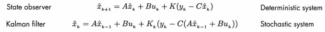 卡尔曼滤波本身便是一个最佳状态估计器,它跟前面讲的状态观察器差不多,不同的是KF是为随机系统设计的。区别如下: