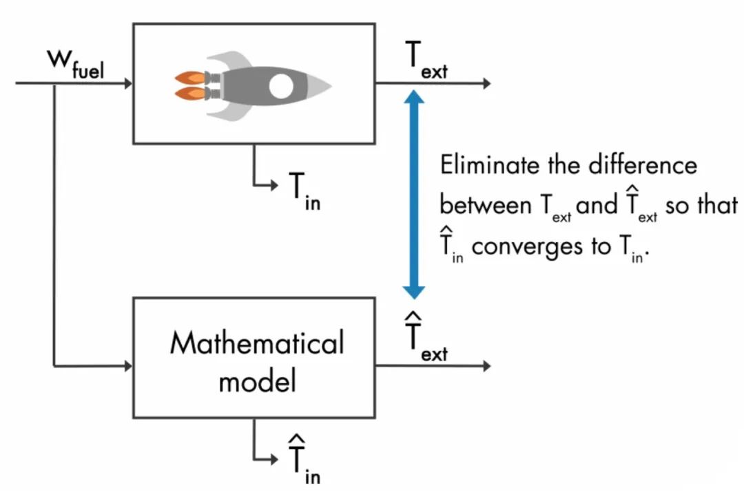 已知我们火箭燃料流量是 ,测量的外部温度是 ,假设我们有个数学模型可以基于 估算出外部 温度 ,那么,我们只要将估计的外部温度 与测量的外部温度 相匹配上,数学模型就会收敛到真 实系统的模型,相应地,数据模型估算的内部温度 也能逼近真实的内部温度。