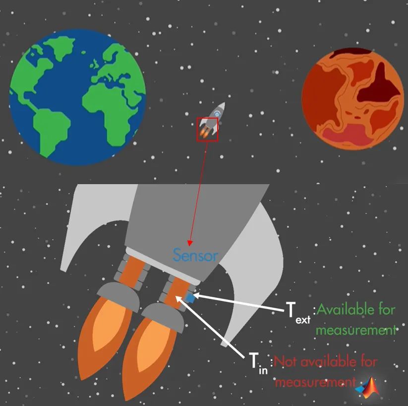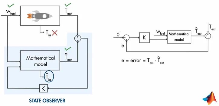 现在有一只火箭要从地球飞往火星,火箭使用液态氢作为燃料,但过高温度会导致火箭喷射器的机械部件损坏,因此监控喷射器内部温度就十分重要,可传感器不支持放置在喷射器内部,否则会被融化掉。但我们可以在喷射器外部的放置温度传感器,间接测量内部温度,但间接测量值和真实值存在误差,为此,我们可以使用状态观察器去基于间接测量值估算出真实值。