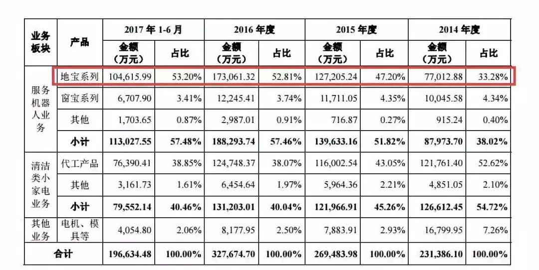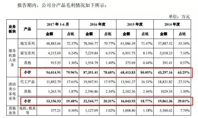 数据显示,服务机器人所占营收比在2014年仅有38.02%,2015年达到51.82% ,2016年则达到57.46%。反之,清洁类小家电业务则从54.72%下降至40.04%。