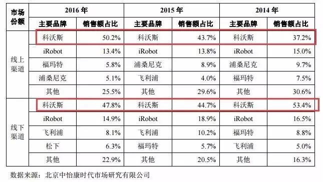 科沃斯自 2009 年推出地宝系列扫地机器以来业绩突飞猛进,2014年-2016年,它靠着淘宝、京东等电商平台,横扫国内扫地机器人市场半壁江山。2016年,科沃斯线上和线下渠道的市占率分别达到50.2%和47.8%,国内销量排名第一。