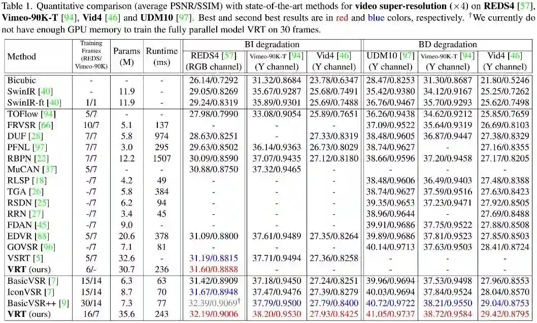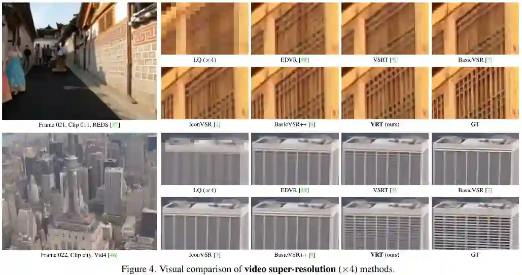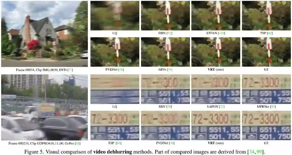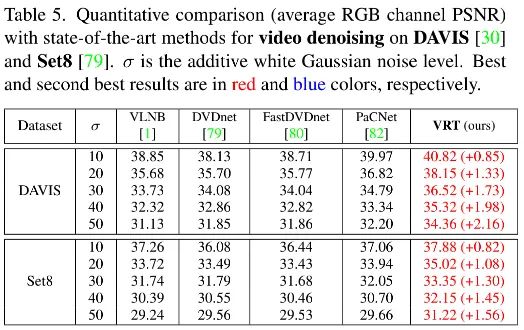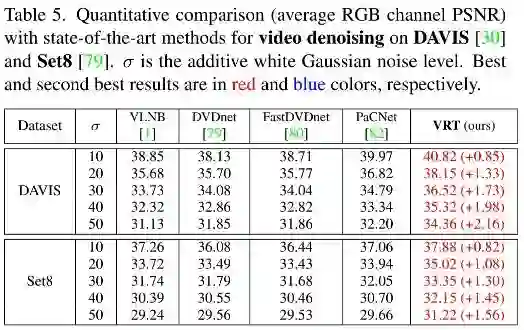 上表给出了DAVIS与Set8数据集上的性能对比,从中可以看到:VRT均取得了超越已有方案的性能,性能提升0.82-2.16dB不等。