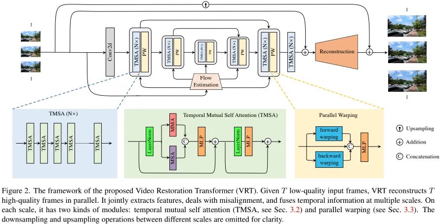 上图给出了本文所提VRT整体架构示意图(注:上图仅为核心部分示意图,还有一部分光流对齐的预处理部分并未示出,同时上图可视化部分为2D形式,而实际则是3D形式)。VRT可以划分为特征提取与图像重建两部分。