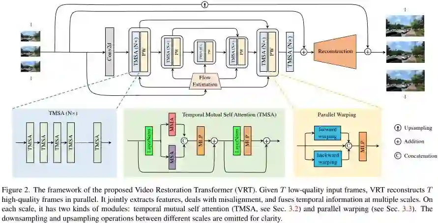 Feature Extraction: 在开始部分,我们采用一个2D卷积提取浅层特征 。然后,我们基于UNet架构设计了一种多尺度网络在不同分辨率进行特征对齐。在不同尺度,我们可以采用两个模块(Temporal Mutual Self-Attention与Parallel Warping)进行特征提取以及运动处理。最后,我们采用多个TMSA模块进一步进行特征提炼得到深层特征 。