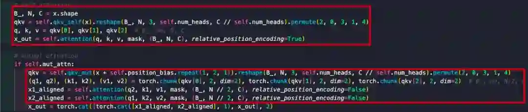 给出了上述计算流程的核心实现,事实上可以看到:自注意力与互注意力的 关键区别体现在Position信息,移除掉Position信息部分后,MMA相当于两路并行MSA(通过调整qkv_mut参数可以等价转换)。自注意力采用的是Position Embedding 的进化版Relative Position Embedding,而互注意力采用的是Sine Position Encoding。