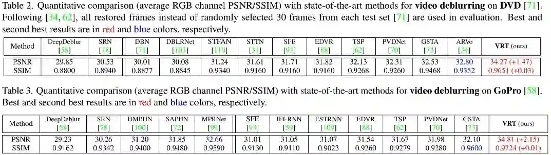 上面两个表格给出了DVD与GoPro两个数据集上不同方案的性能对比,从中可以看到:
