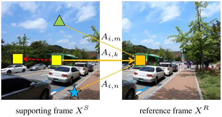 如上图所示,近邻帧中的 与参考帧中的 最为相似,那么 ,进一步可描述如下: