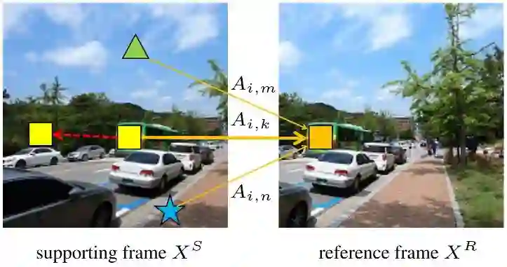 Mutual Attention 给定参考帧(原文为reference)特征 与近邻帧(原文为supporting)特征 ,我们可以通过如下方式计算注意力三元素:
