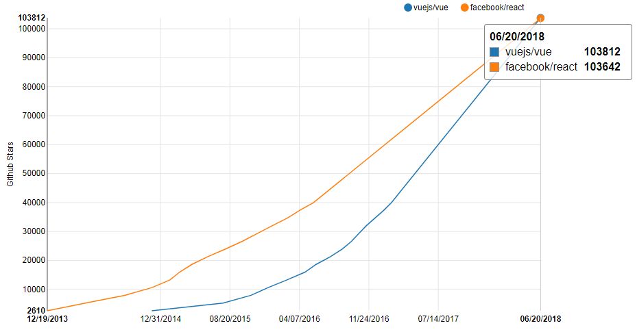 上周在前端的 JavaScript 框架世界发生了一件称得上是“里程碑”的事:Vue.js 在 GitHub 上的 star 数量终于超过了 React.js 的 star 数量。
