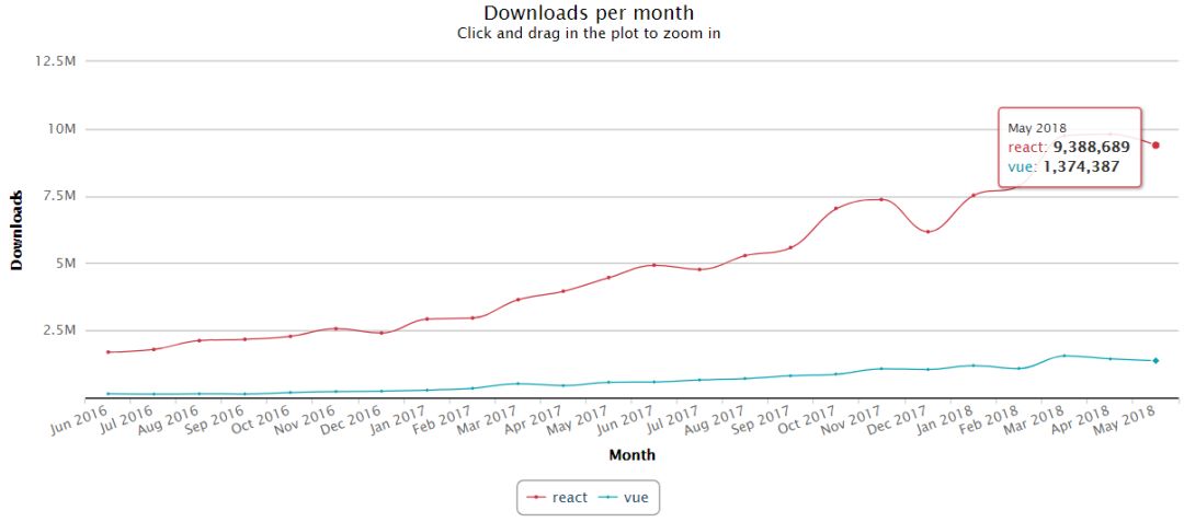 通过深入了解 NPM 的下载统计数据,我们发现尽管大家都围绕着 Vue 疯狂增长的 star 数来大肆宣传,但 React 仍然在 JavaScript 框架世界中稳坐“主导”的位置。它即将超过每月1000万的巨大下载量,并且还一直保持着高速的增长。