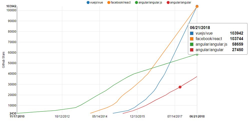 通过使用一个叫做 Star History 的工具,我们可以清楚看到:React 长期以来的“历史主导地位”是如何慢慢被暴涨的 Vue 所超越。