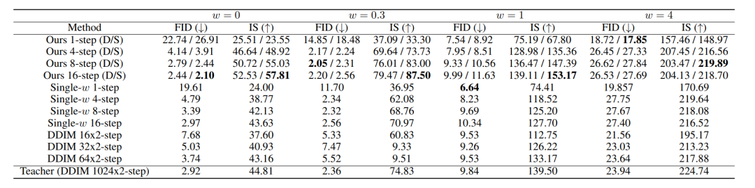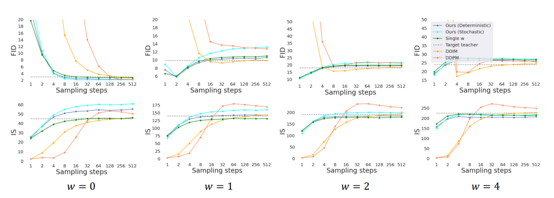 在实验中,以指导区间w∈[0, 4]为条件的模型训练,与w为固定值的模型训练表现相当。在步骤较少时,我们的方法明显优于DDIM基线性能,在8到16个步骤下基本达到教师模型的性能水平。
