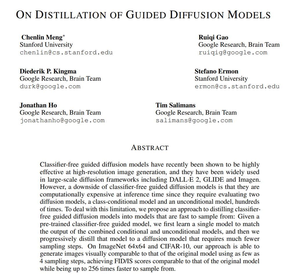 为了解决这个问题,斯坦福大学和谷歌大脑的学者提出使用两步蒸馏(two-step distillation)的方法来提升无分类器指导扩散模型的采样效率。