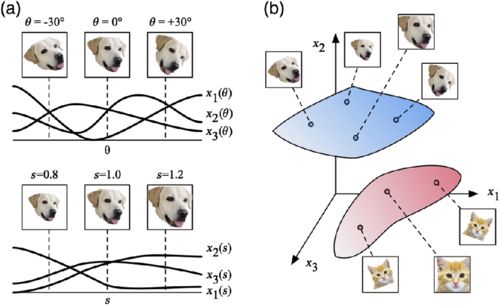 他表示,论文中的图1(下图)基本上提供了关于神经空间中“流形”概念的启发性观点。在神经空间中,我们对一只猫或狗的每个观察的方向/角度/位置变化都可以视作一个由神经元放电频率构成的平面或“流形”。图中蓝色对应为狗,粉色对应为猫。如果这两个区域没有交集,神经网络就能够分辨出猫和狗。