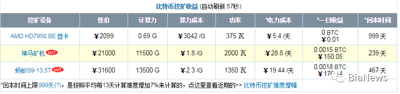 比特范网站提供的数据显示:一台专业的蚂蚁S9-13.5T矿机,售价大概是31600元,功率是1350瓦。运行24个小时,可以挖出0.0018 个比特币,挖一个比特币需要556天。
