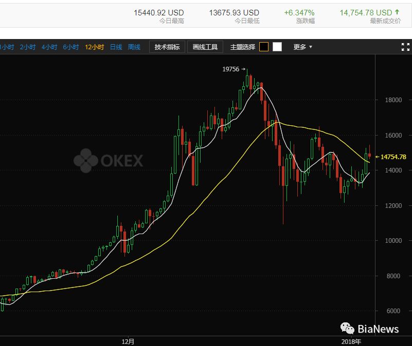 比特币随后呈现下滑趋势,目前每枚已跌落15000美元。