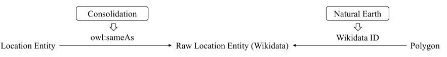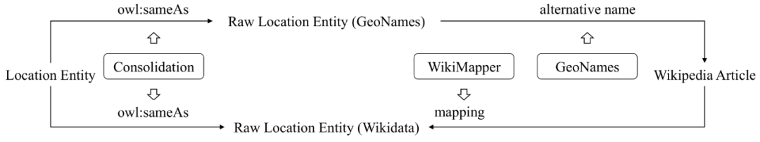 实体构建:我们收集了 GeoNames 的所有实体和 Wikidata 的含中文标签和经纬度的地理实体。我们使用了两个数据源中原有的实体之间的对应关系。此外,我们使用启发式的方法得到了 GeoNames 中可能重复的实体之间的关系。最后我们使用这些对应关系将相同实体合并为 CKGG 中的一个实体。