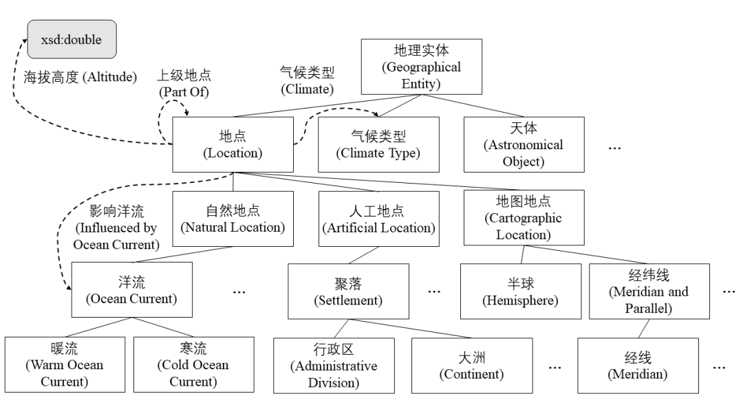 定义类:我们使用自顶向下的方法,定义了地理实体大类,在大类下定义了地点、气候类型等子类,并根据教辅资料和常识对类进行了进一步细分。