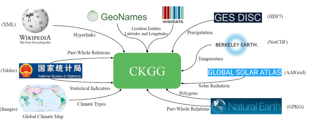 为解决高质量高中地理知识图谱缺乏的问题,我们首先从教辅资料中构建了覆盖高中地理核心概念的本体。以此为基础,我们构建了中文高中地理知识图谱 CKGG (Chinese Knowledge Graph for Geography),覆盖高中阶段的核心知识。我们基于 GeoNames 和 Wikidata 的实体合并得到了 CKGG 中的地点实体,并使用了多种工具整合了不同来源不同格式的数据。CKGG 共包含 15 亿个 RDF 三元组,120 余万实体。下图概述了 CKGG 的数据来源。