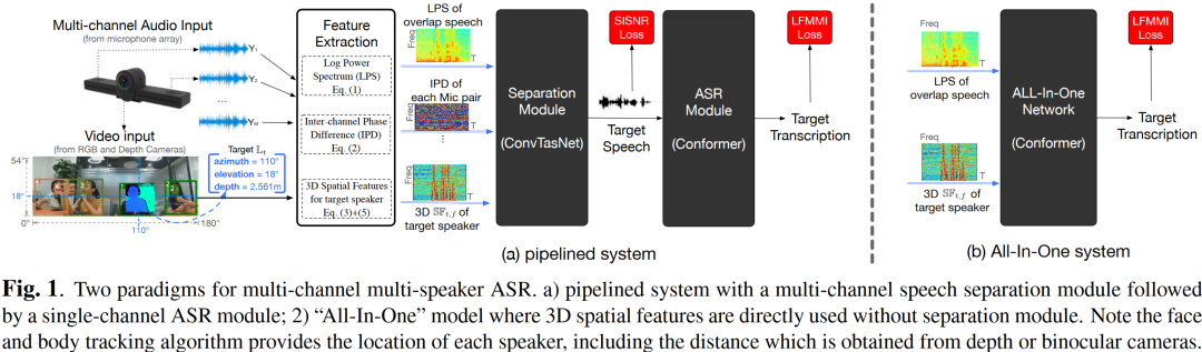 本文提出了两种范式:1) 多通道语音分离模块,和单通道 ASR 模块 的级联系统;2)“All-In-One”模型,其中 3D 空间特征直接用作 ASR 系统的输入,无需显式分离模块。它们都是完全可导的,并且可以端到端反向传播。
