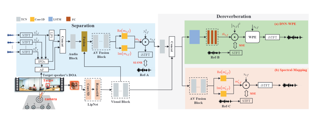 本文提出了一种将视觉模态同时应用于语音分离,语音去混响和语音识别的一体化系统。并提出使用最大化互信息的训练准则来联合调试系统中的分离,去混响和识别模块。