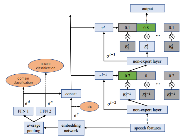 在团队之前的工作中,语音动态神经网络仅采用局部的embedding来帮助路由做出路由决策。为了进一步提高针对不同域和口音的语音识别性能,本文提出了一种新的路由器架构,该架构将额外的全局域和口音嵌入到路由器输入中以提高适应性。