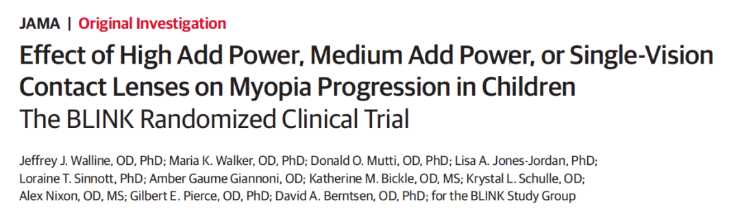 而近日,美国俄亥俄州立大学视光学院的研究人员在《美国医学会杂志》(JAMA)上发表题为:Effect of High Add Power, Medium Add Power, or Single-Vision Contact Lenses on Myopia Progression in Children The BLINK Randomized Clinical Trial 的研究论文。