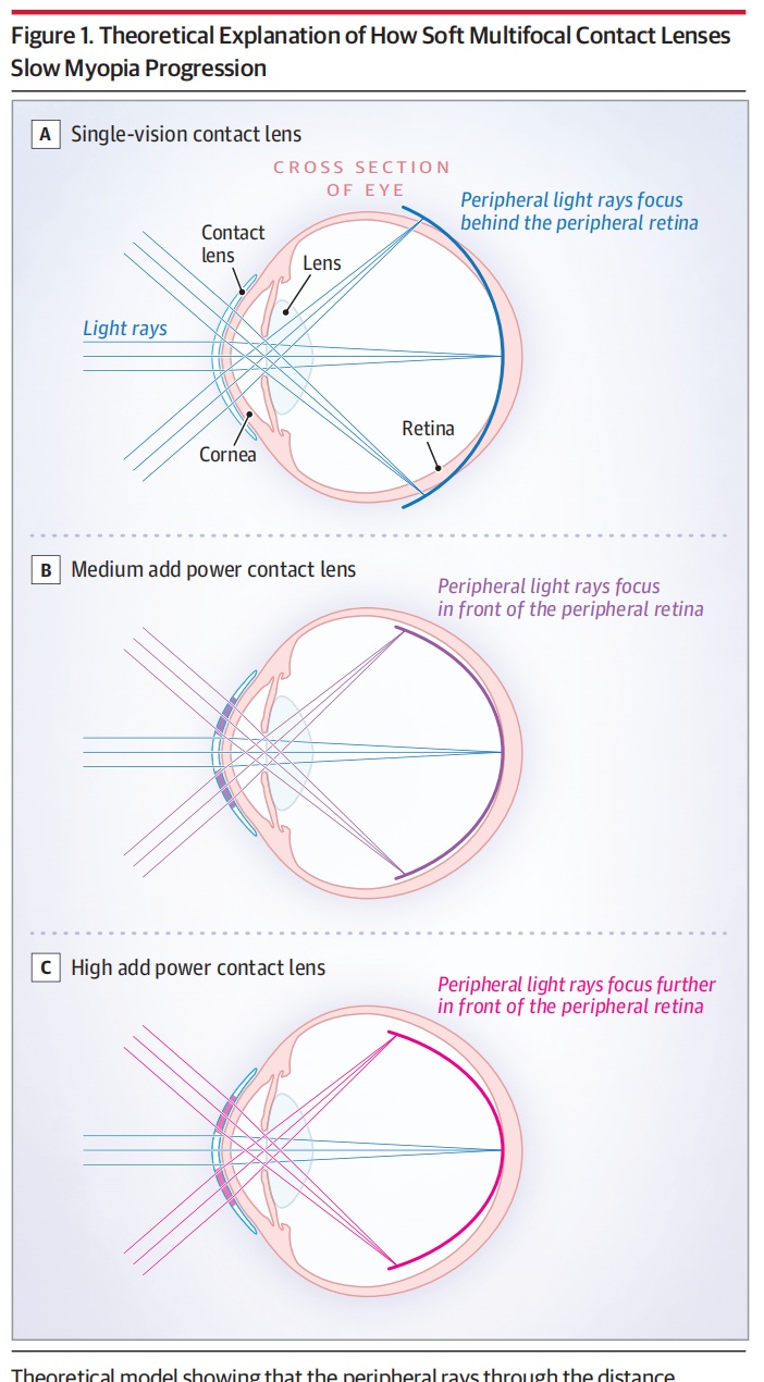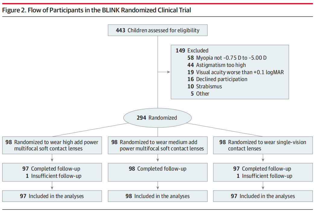 [1] Walline JJ, Walker MK, Mutti DO, et al. Effect of High Add Power, Medium Add Power, or Single-Vision Contact Lenses on Myopia Progression in Children: The BLINK Randomized Clinical Trial. JAMA. 2020;324(6):571–580. doi:10.1001/jama.2020.10834