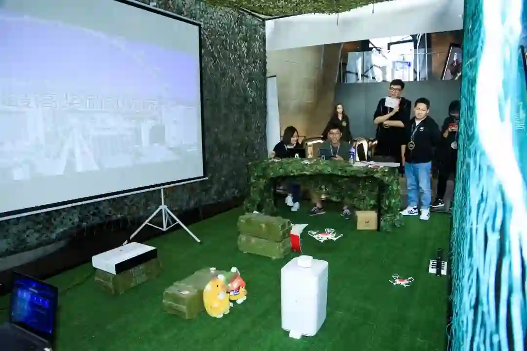 2018年10月24日,“米兔特工队-终极密码”登陆GeekPwn大会现场,我们给大家搭建了一个封闭式游戏体验区,体验区由迷彩布料和护网围成,地面铺上了绿色的草坪,并布置了米兔遥控小飞机、米家家居套装、米家投影仪等小米产品,整个体验区像一个军事“战场”,又充满着科技感。