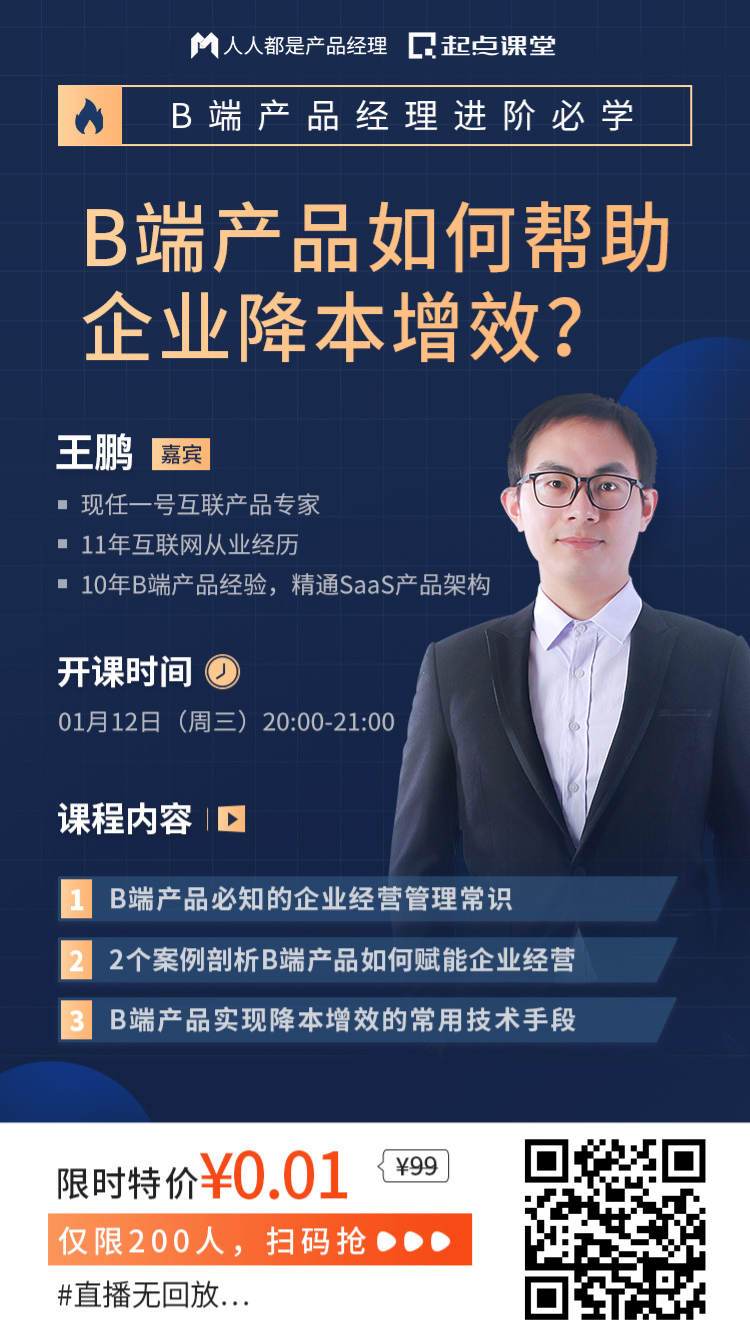 这是由起点课堂出品的B端产品公开课,专为正在做B端产品同学,或者对B端产品感兴趣想要了解相关工作内容的同学打造,课程将由现任一号互联产品专家@王鹏老师直播授课。