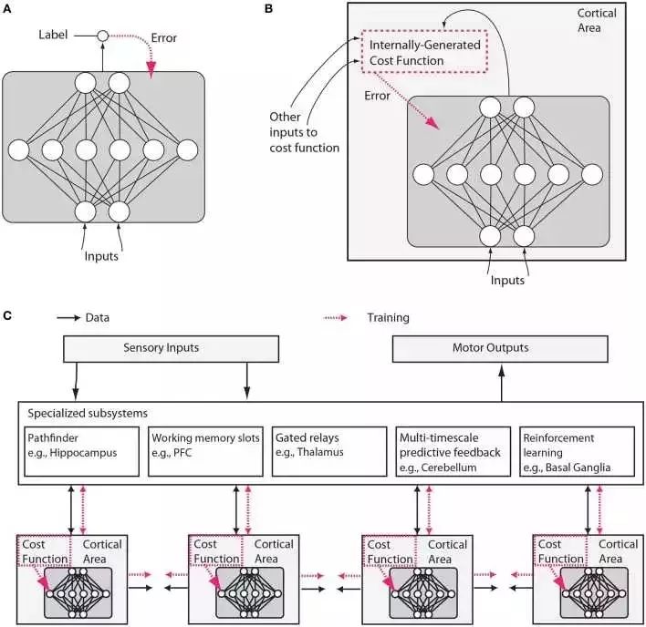 Figure 1. 传统人工神经网络和类脑神经网络设计之间的假设差异。 (A)在常规深度学习中,监督训练基于外部提供的标记数据。 (B)在大脑中,网络的监督训练仍然可以通过对误差信号的梯度下降发生,但是该误差信号必须来自内部生成的成本函数。这些成本函数本身是由遗传基因和后天学习所指定的神经模块计算而来。内部生成的成本函数创建heuristics(这个实在不好翻译,“启发”有些抽象,类似于元信息,大家意会吧),用于引导更复杂的学习。例如,识别面部的区域可以首先使用简单的heuristic来训练以来检测面部,这种heuristic就比如是在直线之上存在两个点,然后进一步训练以使用来自无监督学习的表示结合来自其他与社交奖励处理相关的大脑区域的错误信号来区分显著的面部表情。 (C)内部生成的成本函数和错误驱动的神经皮质深层网络经过训练形成包含几个专门系统的较大架构的一部分。虽然可训练皮层区域在这里被示意为前馈神经网络,但是LSTM或其他类型的recurrent网络可能才是更较精确的比喻,并且许多神经元和网络性质例如神经脉冲、树突计算、神经调节、适应和稳态可塑性、定时依赖性可塑性、直接电连接、瞬时突触动力、兴奋/抑制平衡、自发振荡活动、轴突传导延迟(Izhikevich, 2006)等将影响这些网络学习的内容和方式。